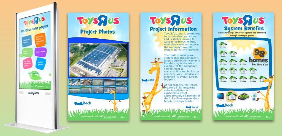 When Toys 'R' Us installed their 5.4MW rooftop solar system at their Delivery Center in Flanders NJ, we helped them showcase the effects of their efforts. Using our large format touchscreen kiosks, shoppers are able to be entertained while learning about the the system.